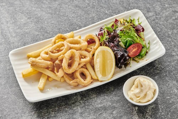 Deep fried calamari served with chips and lime aioli