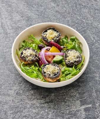 Mix leaf lettuce, Tomato, Cucumber, Spanish Onion, Capsicum, Olives & Reduced balsamic glaze